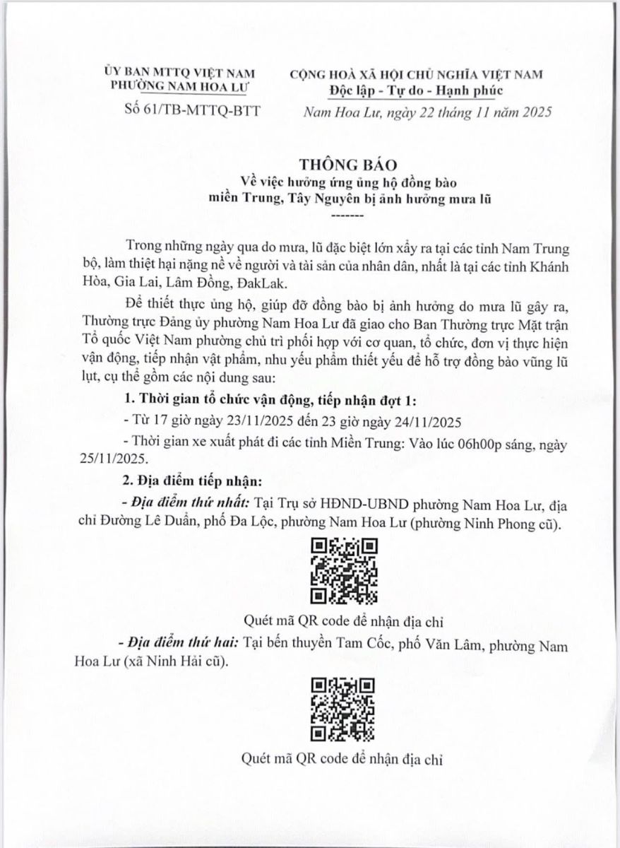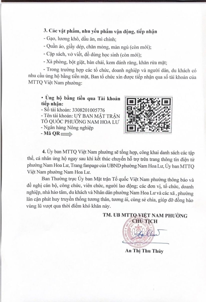 – Trong trường hợp các bậc phụ huynh và người dân, du khách có nhu cầu ủng hộ bằng tiền mặt, Ban tổ chức xin được tiếp nhận qua số tài khoản của MTTQ Việt Nam phường: